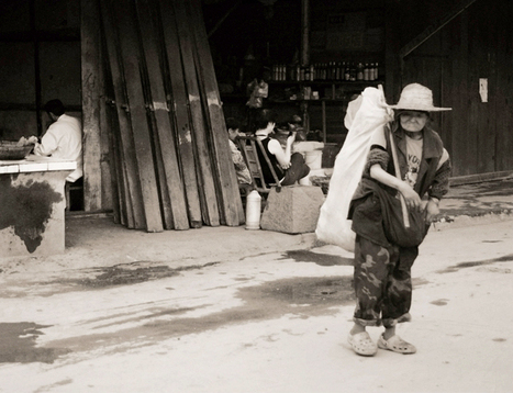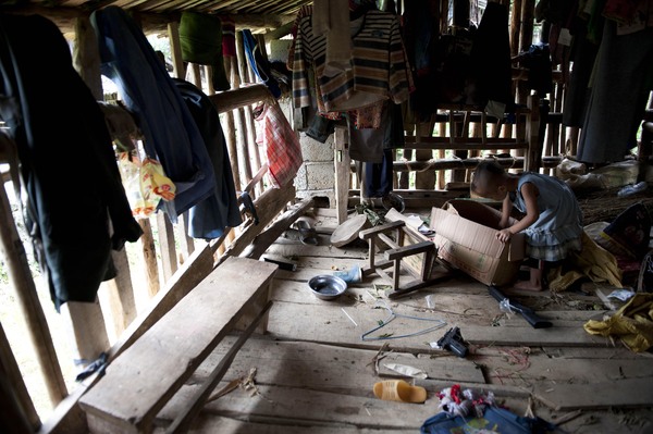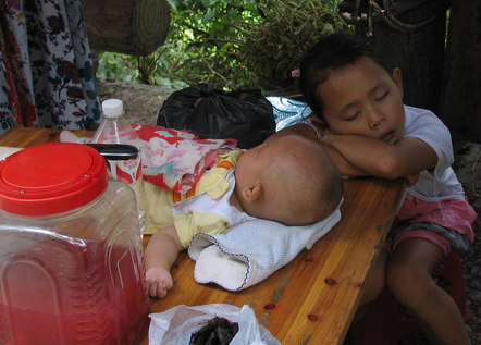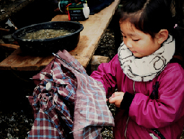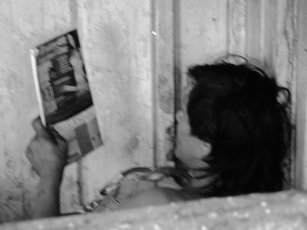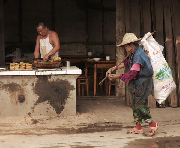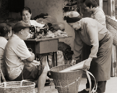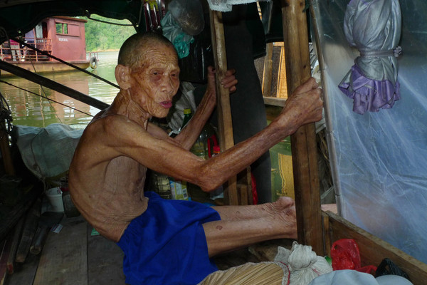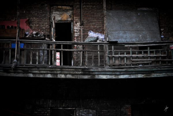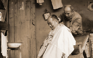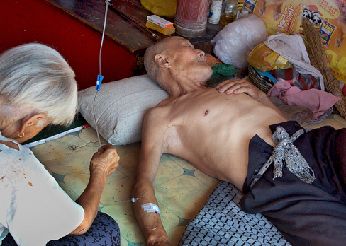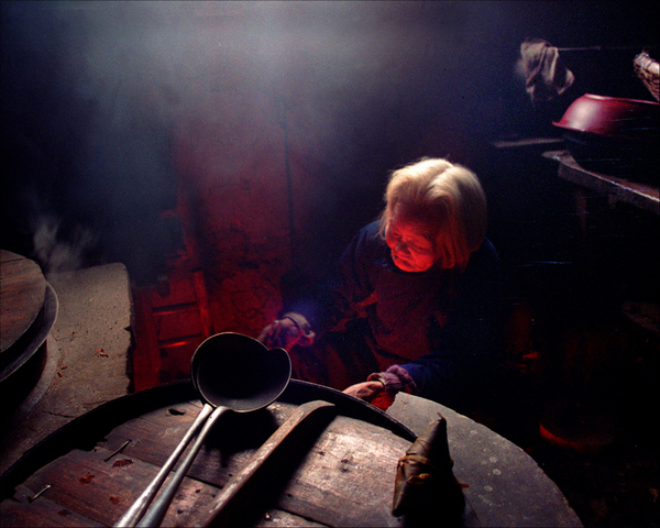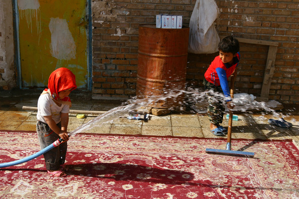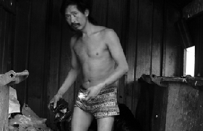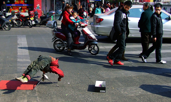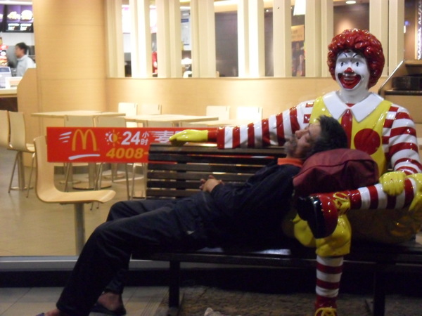 一位街头露宿者用扇子为取暖用的火盆鼓风