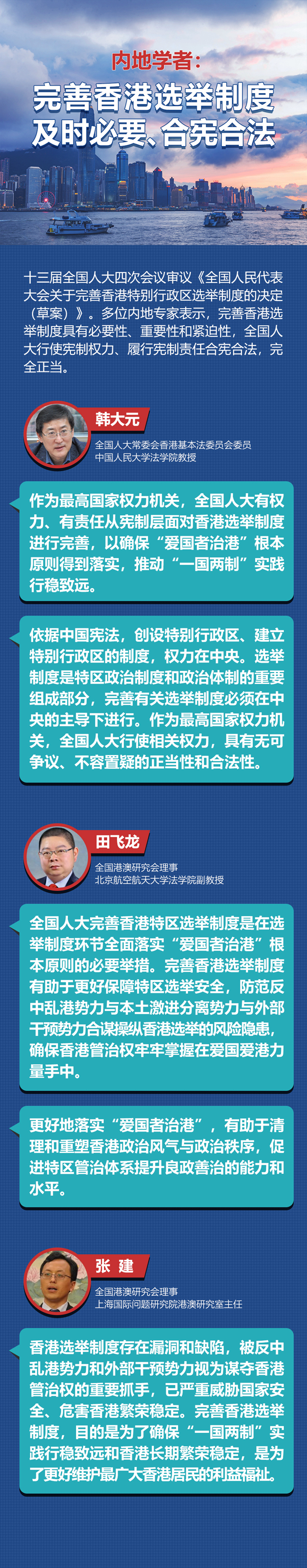 新华社北京3月6日电(记者查文晔 许晓青)十三届全国人大四次会议审议《全国人民代表大会关于完善香港特别行政区选举制度的决定(草案)》。多位内地专家接受记者采访表示,完善香港选举制度具有必要性、重要性和紧迫性,全国人大行使宪制权力、履行宪制责任合宪合法,完全正当。