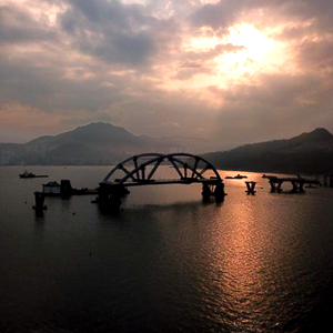 2月25日傍晚,将军澳海湾斜阳夕照,波光粼粼。远远看去,一艘巨大的驳船“驮”着一座双拱钢桥静静地停泊在海面中间。