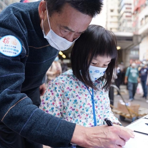 3月12日,在香港湾仔,周先生带着6岁的女儿来到签名桌前和女儿一起写下名字。新华社记者 王申 摄