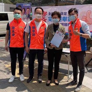 3月15日,香港特区行政长官林郑月娥(右二)在位于港铁坚尼地城站的街站展示签名。新华社发