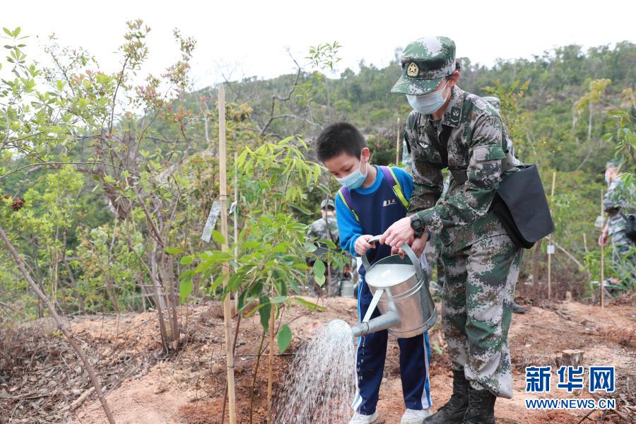 3月21日,驻澳门部队女兵与小朋友一同给新栽种的树苗浇水。新华社发(陈帅 摄)
