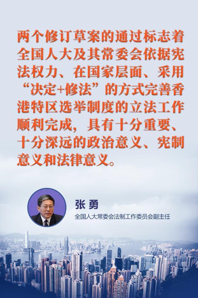 新华社北京3月30日电 十三届全国人大常委会第二十七次会议审议通过了对香港基本法附件一和附件二的修改。全国人大常委会法制工作委员会副主任张勇受访指出,这两个修订草案的通过标志着全国人大及其常委会依据宪法权力、在国家层面、采用“决定+修法”的方式完善香港特区选举制度的立法工作顺利完成,具有十分重要、十分深远的政治意义、宪制意义和法律意义。