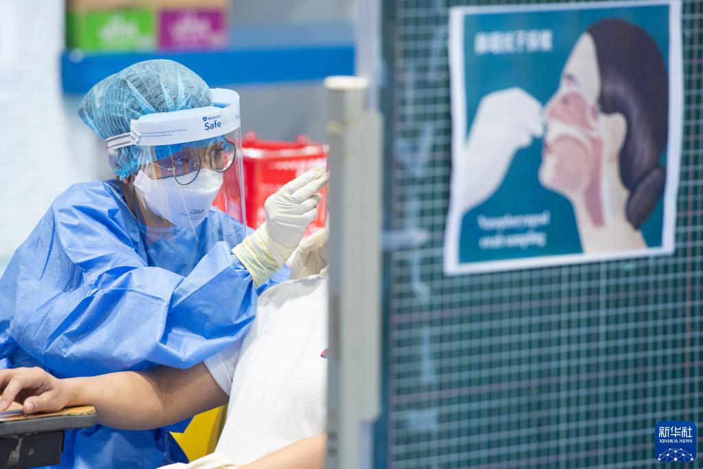 医护人员在澳门利马窦中学全民核酸检测站为市民采样(8月4日摄)。新华社记者 张金加 摄