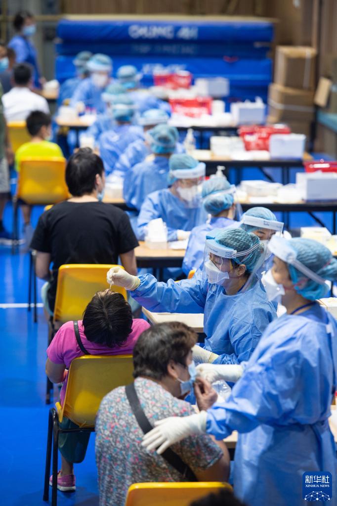 广东省医疗人员在澳门塔石体育馆为市民采样(8月6日摄)。新华社记者 张金加 摄