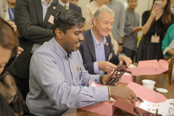 马来西亚驻港副总领事Yoganthiran(左)与太平洋咖啡 副董事长Jonathan Somerville 一同制作红木宫灯,感受非遗文化的魅力。Jonathan Somerville表示,活动非常有趣和有意义。