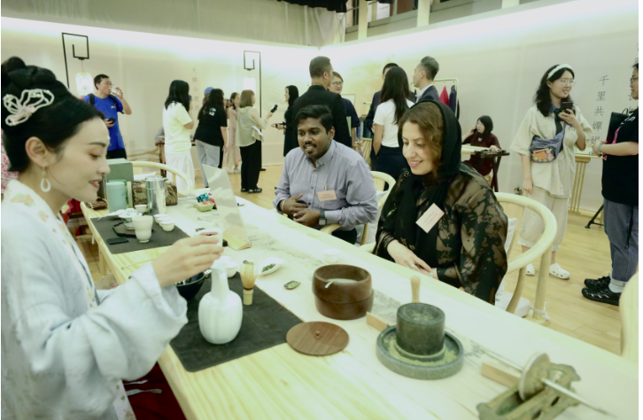 在民俗展示馆,有岭南古琴表演,有非遗点茶技艺展示,有特色糕点制作介绍;在非遗技艺传承人的指导下,多位驻港领事兴趣盎然地排队参与互动项目,写汉字,装组件,亲手制作喜气洋洋的红木宫灯。本次非遗展示还特意加入了“广绣和蜀绣”的对话环节,刺绣技艺在两种不同地域的传承中,呈现出独特的美感和韵味,令外国友人流连忘返。