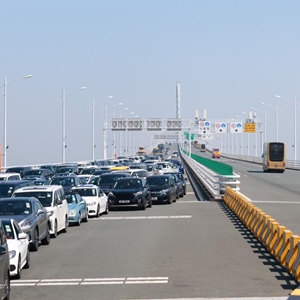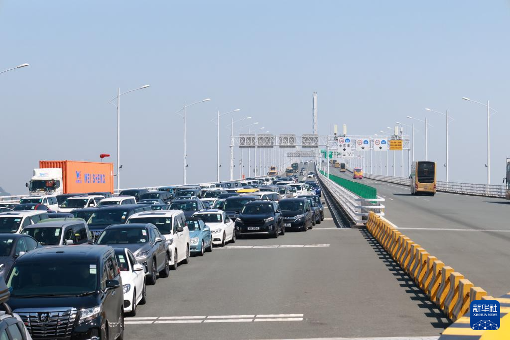 3月9日拍摄的港珠澳大桥桥头等待北上的车辆。新华社发(王相国摄)