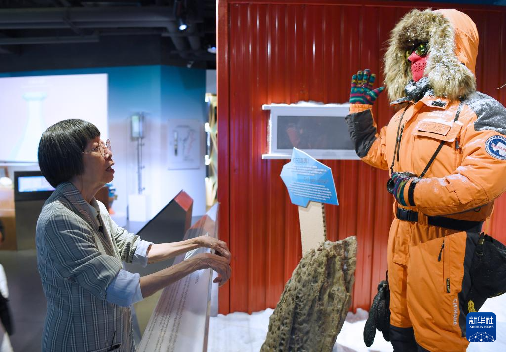 在香港赛马会气候变化博物馆内,李乐诗博士讲解她在南极考察时所穿的防寒服(7月8日摄)。 新华社记者 陈铎 摄