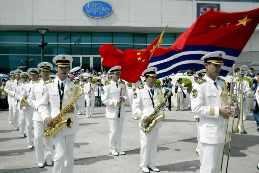 2004年5月1日,中国人民解放军海军军乐团在香港金紫荆广场为市民及游客演出。新华社记者李鹏摄