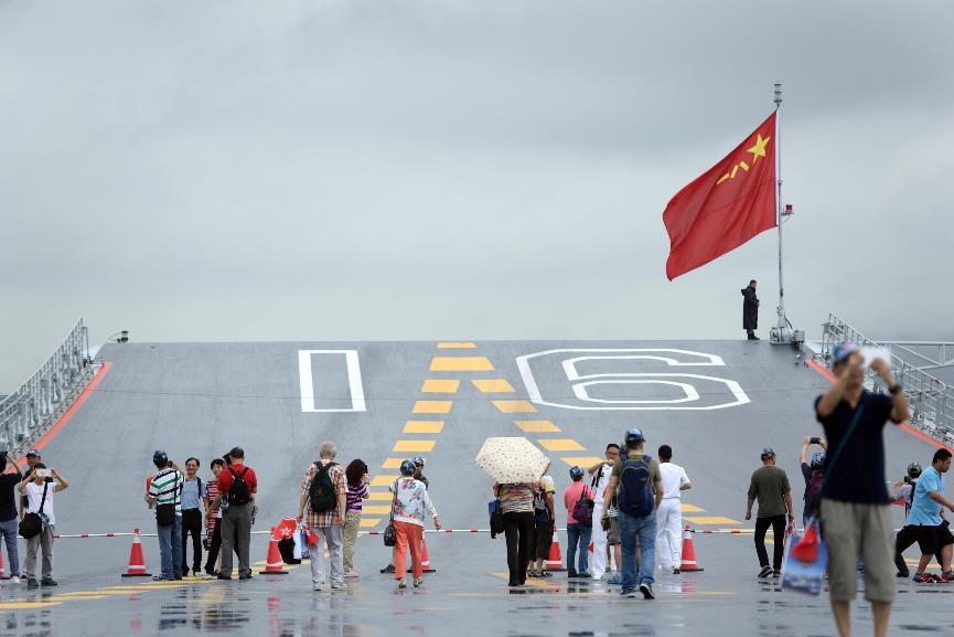 2017年7月8日,香港市民在辽宁舰的飞行甲板上参观。7月8日及9日,中国首艘航空母舰辽宁舰在香港向公众开放。新华社记者秦晴摄