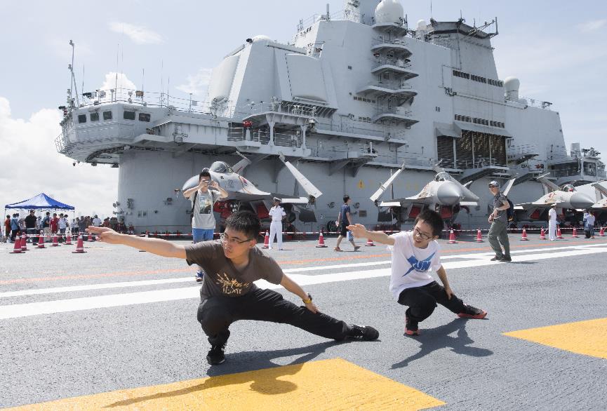2017年7月9日,两名青少年在辽宁舰的飞行甲板上模仿“航母STYLE”动作。7月8日及9日,中国首艘航空母舰辽宁舰在香港向公众开放。新华社记者刘昀摄