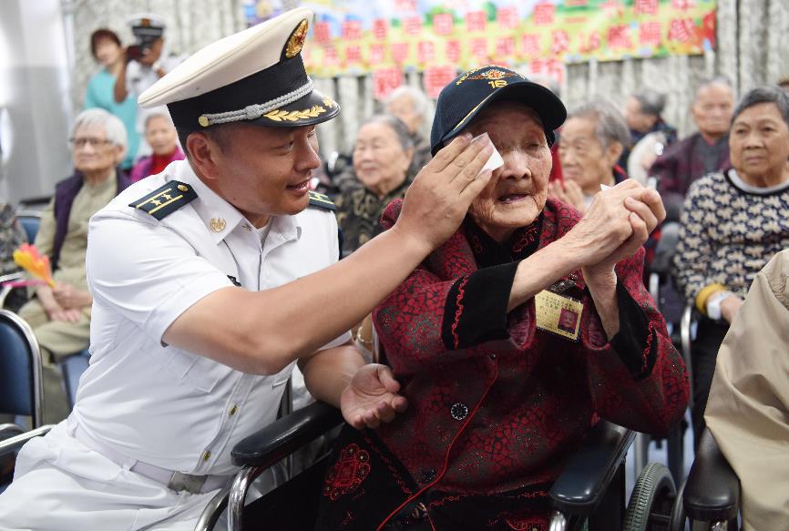 2017年7月10日,辽宁舰航母编队的一名军官为110岁的老人谢月琼擦拭眼泪。当日,辽宁舰航母编队及解放军驻香港部队的60余名官兵一道前往香港亚洲妇女协进会何梁洁庭颐养之家护理院开展联合慰问长者活动,向长者们赠送纪念品、捐赠慰问金及表演文艺节目。此次活动是辽宁舰编队官兵在香港的一项慈善公益活动。新华社发(王申 摄)