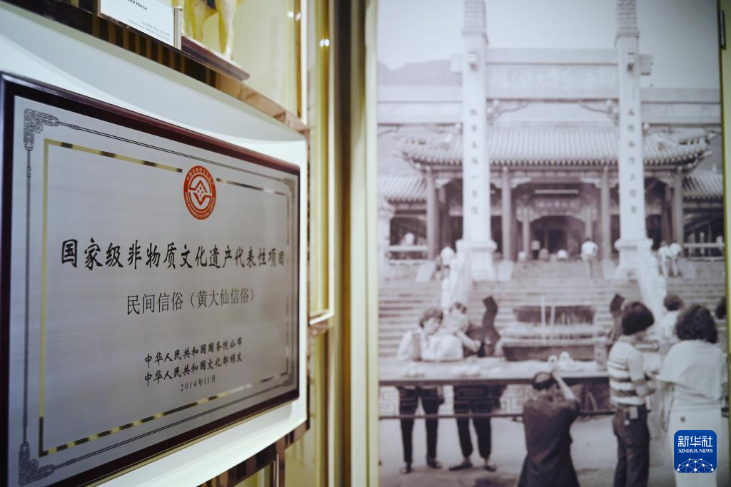 这是这是7月12日拍摄的香港黄大仙信俗文化馆陈列的国家级非物质文化代表性项目牌匾及黄大仙祠老照片。新华社发(王申摄)