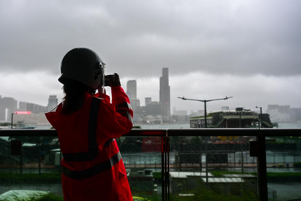 7月20日,一名港铁工作人员在香港维多利亚港关注风势。新华社记者 朱炜 摄