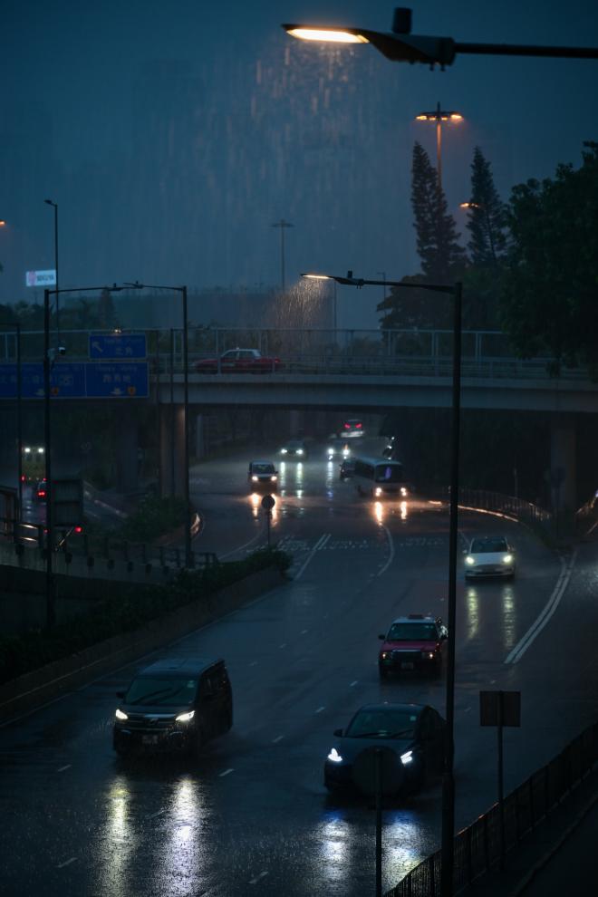 8月5日,车辆在香港街头雨中行驶。新华社记者 朱炜 摄