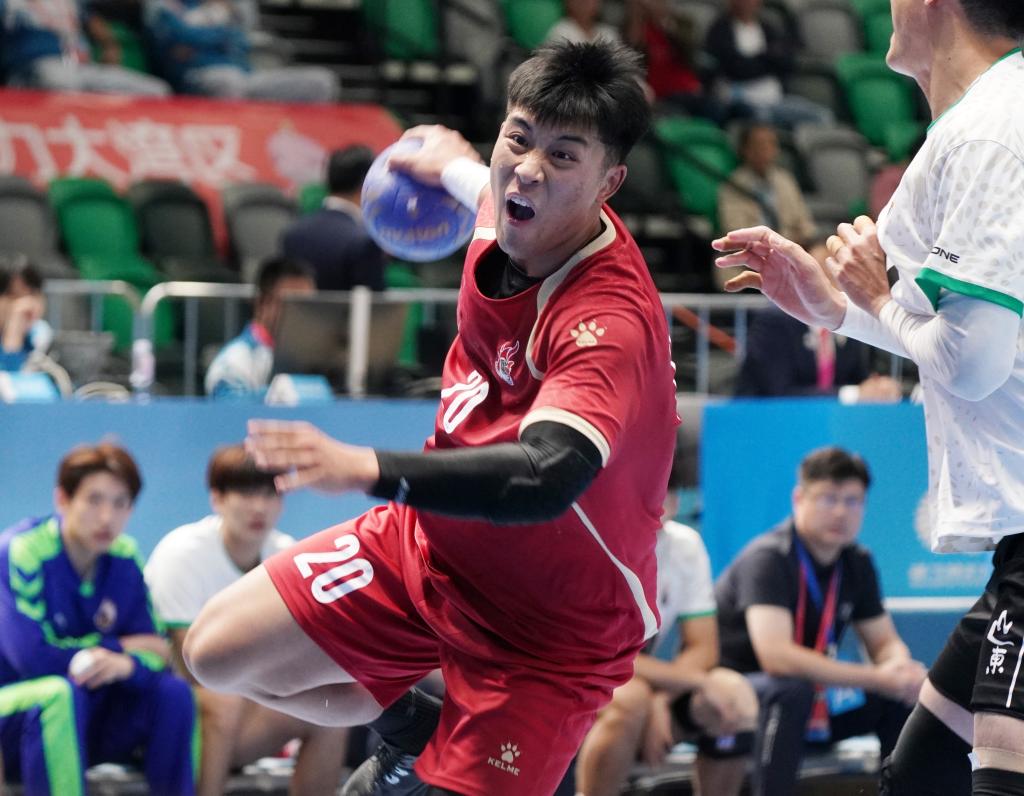 11月3日,山西队球员刘文东(左)在比赛中进攻。当日,在香港启德体艺馆举行的第十五届全国运动会男子手球预赛B组比赛中,山西队33比32战胜山东队。新华社发 (王申 摄)