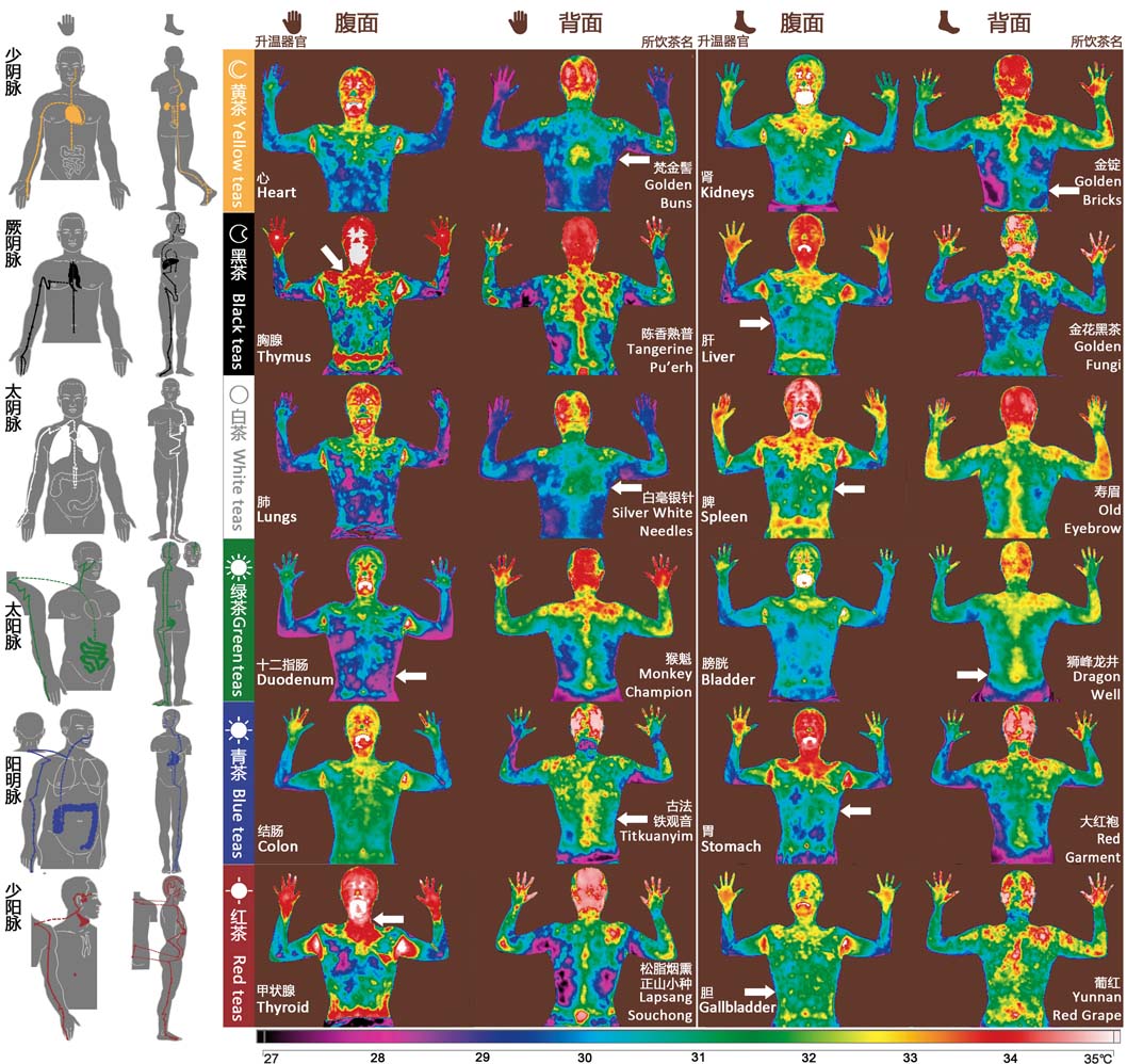 这种红外辐射在喝茶后的几秒钟内就会激发,但往往不会整条经络同时激发,而是分段地显现。只有极其特殊的情况下,归经效应特别强的茶种才能让整条经络几乎同时发出红外辐射。