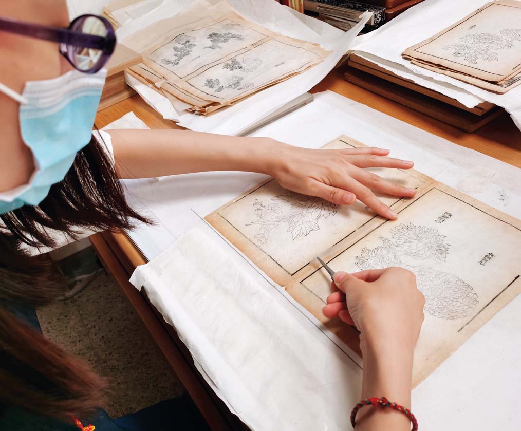6月17日,国家图书馆古籍修复人员在修复画谱