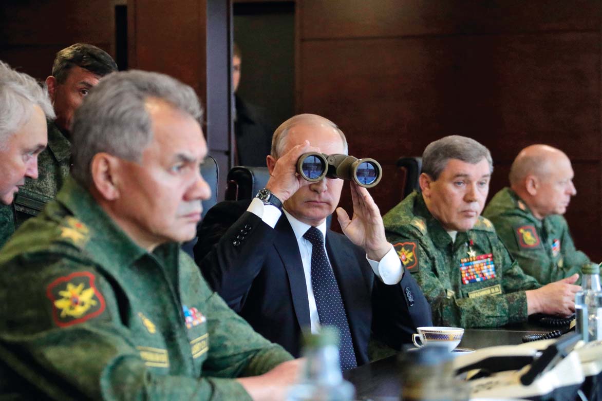 在俄罗斯列宁格勒州,俄总统普京(中)在俄国防部长绍伊古(前左)、