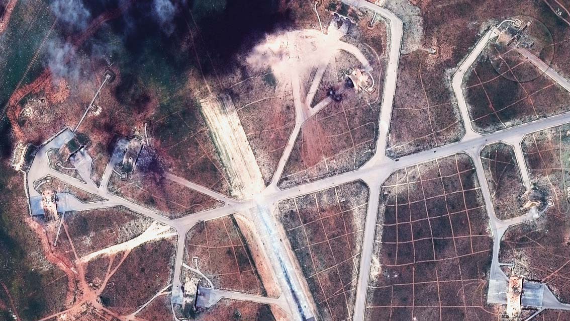 这张美国军用卫星照片显示的是遭军事打击后的叙利亚中部霍姆斯省的沙伊拉特军用机场
