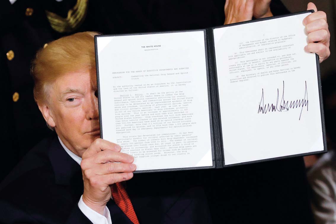 2017年10月26日,时任美国总统特朗普展示签署的有关遏制阿片类药物滥用的备忘录