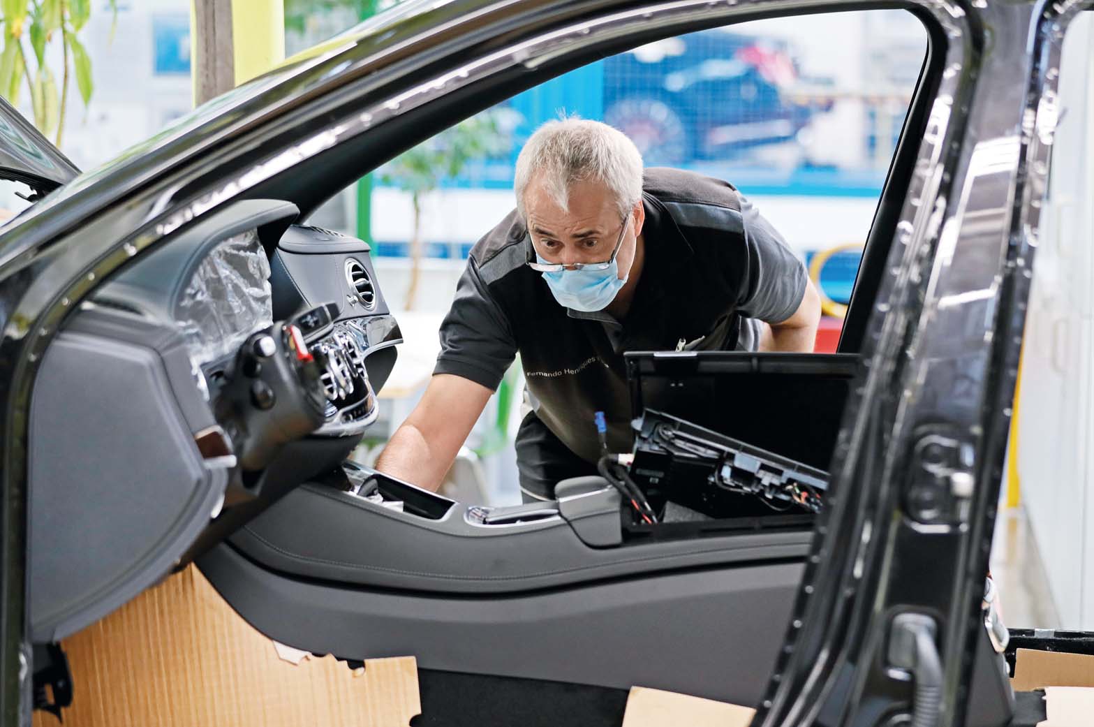 在德国辛德尔芬根的汽车工厂,工人在奔驰S级汽车组装线上工作
