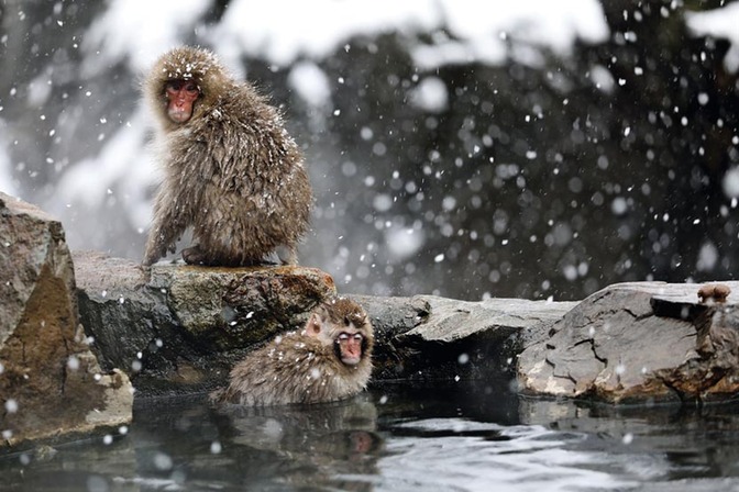 2019年12月27日,在日本长野地狱谷野猿公苑,雪猴在享受温泉