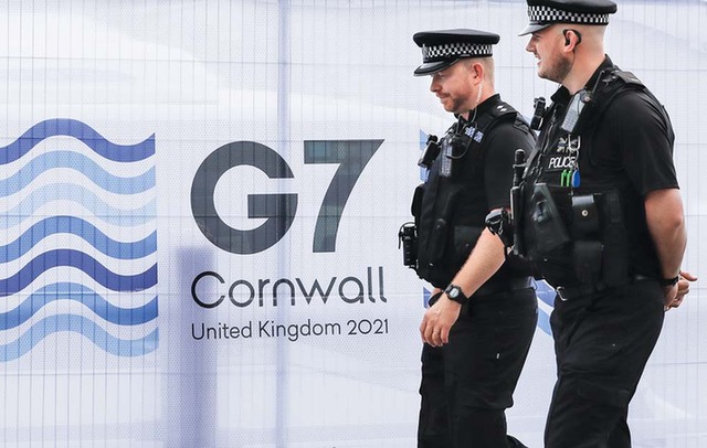 2021年6月11日,警察在位于英国康沃尔郡法尔茅斯的七国集团峰会新闻中心外执勤