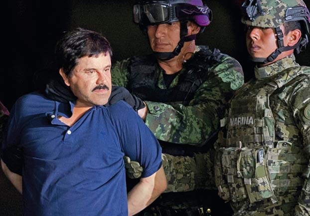 2016年1月8日,在墨西哥首都墨西哥城,士兵押送大毒枭华金·古斯曼