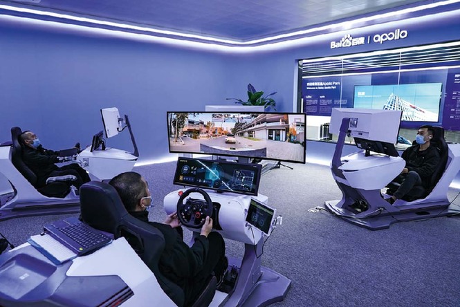 在北京经济技术开发区5G云代驾的操控室内,工作人员远程监控、操控无人车