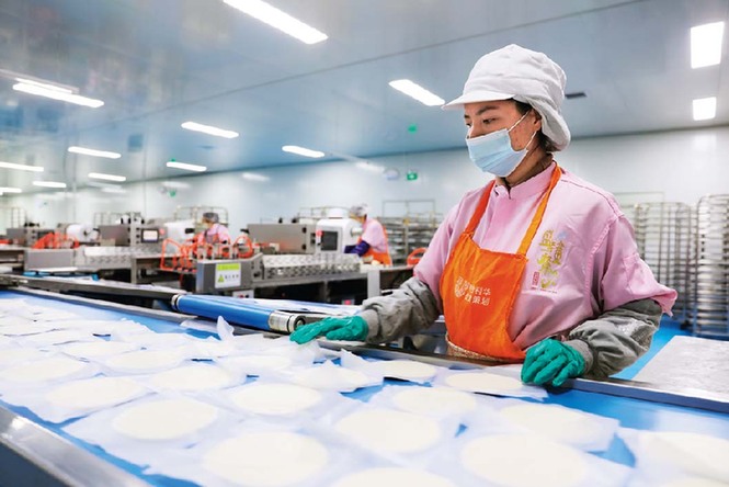 2月16日,工人在生产线上制作肉夹馍饼胚