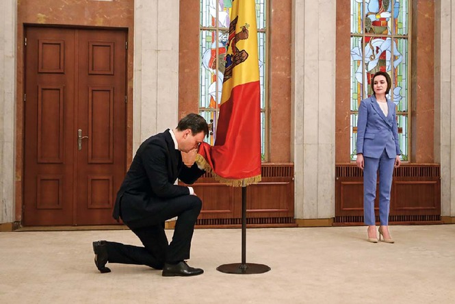 2月16日,在摩尔多瓦基希讷乌,新任总理多林·雷切安(左)和总统桑杜出席新政府宣誓就职仪式
