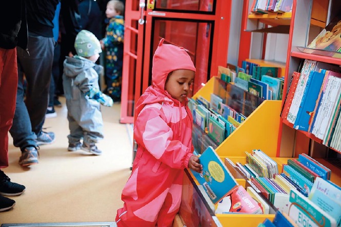 2018年4月18日,一名孩子在芬兰赫尔辛基的儿童流动图书馆挑选图书