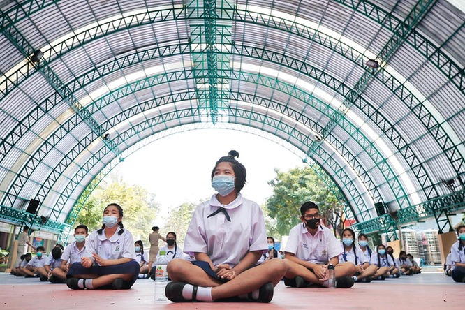 2021年2月1日,戴口罩的学生在泰国曼谷一所学校保持社交距离就座