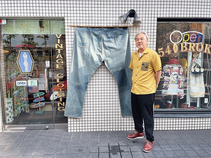 成田亘的古旧服装店位于日本东京涩谷区惠比寿居民区一条僻静的街道上,街对面有一棵逾百年的樱花树。店门口挂着一条1.7米长的李维斯牛仔裤,那是厂家用来做广告展示用的,几年前他想方设法得到它,当宝贝挂在小店门口。没人能穿得上这么大型号的裤子,当然,即便有人想买,他也绝对不会卖。
