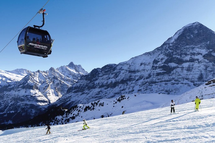 在瑞士格林德尔瓦尔德,人们在少女峰滑雪场滑雪