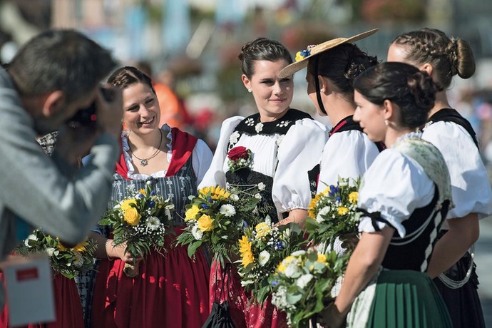 在少女峰所在地因特拉肯,人们身着传统服装参加阿尔卑斯牧羊人节