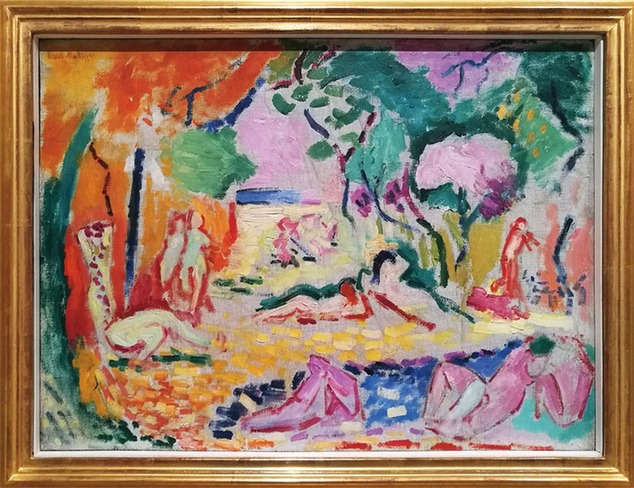 浓到化不开的油彩被整块涂抹在画布上,作品并不追求复现自然的透视或者明暗关系,却给观看者带来强烈的视觉冲击和深刻印象。这是我第一次沉下心来观看马蒂斯的画,又恰好这座博物馆收藏了他最为经典的《戴帽子的女人》和《生活的欢愉》,最能体现他的画作的上述特点。《戴帽子的女人》中,人物轮廓虽然简化但仍算得上清晰,而《生活的欢愉》中沐浴在艳阳下的人物群像,则只用模糊不清的几笔勾勒,完全靠色彩区分出画面中的不同元素,的确有几分野兽派的味道,也不禁令人联想起高更的一系列关于大溪地女人的作品来。