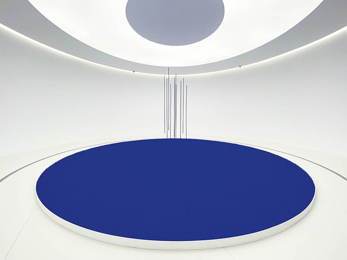 在嘉德艺术中心的展览上,观众可以看到不同时期和形态的蓝色单色画、多幅《人体测量学》以及各种颜色的地球模型。然后,观众们会进入一个屋顶和四壁皆白的展厅,克莱因蓝颜料呈圆形平铺于地面,占据了整个展厅,12根蓝色木棒从展厅顶部垂直而下。这是将克莱因《纯颜料》和《蓝雨》结合展示的效果,此前《纯颜料》在世界其他地区展出时,基本是用方形呈现,在中国的展陈属于一种创新,被称为“逝世后版本2023”。