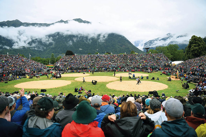 在因特拉肯镇中央草坪上搭建的临时体育场,人们用细木屑铺出了5个圆形摔跤场地,120名瑞士最优秀的传统摔跤手在此角逐桂冠。参赛者大多膀大腰圆,很多人的体重超过130公斤。