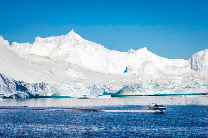 2022年6月28日,在丹麦格陵兰岛迪斯科湾,一艘船驶过漂浮的冰山