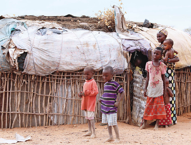 2022年8月26日,在遭受旱灾的肯尼亚马萨比特郡莱萨米斯镇一座村庄,一名母亲和她的孩子站在自家门前