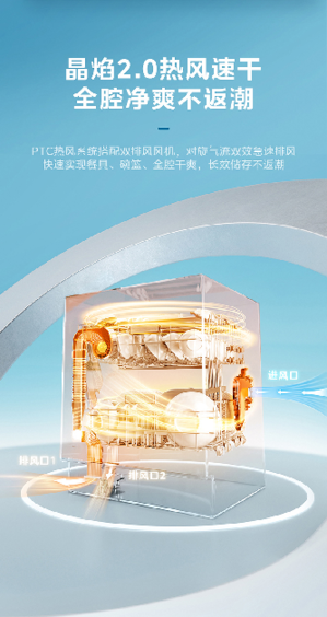 为解决餐具烘干和传统洗碗机长久储存返潮异味难题,美的晶焰洗碗机在洁净碗碟的基础上,全新升级晶焰2.0速干技术,搭载PTC热风系统配合双排风风机,对旋气流双效急速排风,将洗烘时间缩短41.5%,快速实现餐具、碗篮、全腔速干,7天长效抑菌存储不返潮,更加便捷省时省心。经权威机构测试,其腔内干燥指数1.26,远高于国标1.08,获得中国家电研究院一级速干认证。同时,它还具备四星消毒,能有效杀灭大肠埃希氏菌、金黄色葡萄球菌等致病细菌,除菌率高达99.99%,严防“病从口入”,更好的呵护家人健康。