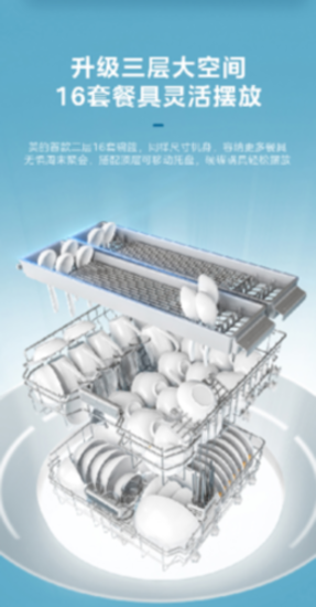 此外,面对过年聚餐大量碗碟的烦恼,在碗篮结构上,首款采用16套三层中式波浪碗篮设计,不仅满足不同大小、深度餐具摆放需求,而且超大空间可容纳更多餐具,无惧周末聚会,搭配顶层可移动托盘,锅具也可轻松洗,更符合中国家庭使用习惯。