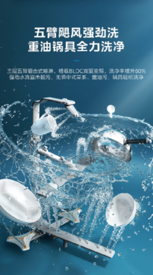 针对中国饮食习惯以及餐具形态多样的问题,美的晶焰洗碗机创新采用自研五臂飓风洗科技,通过变频高压水流进行360°无死角冲刷,强效去除顽固油污和边角部分,解决传统洗碗机内普通喷臂清洗不彻底、冲刷不到位的痛点,让碗碟洁净如新。
