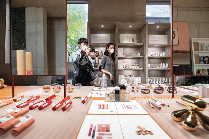 2020年10月27日,人们参观位于韩国首尔城东区的爱茉莉圣水美妆体验空间