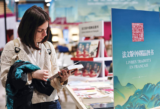 4月12日,一名女子在法国巴黎临时大皇宫举行的2024巴黎书展上翻阅中国图书