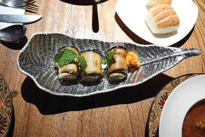 茄子卷,造型类似云南菜里的薄荷牛肉卷,只不过外面裹着一层切成薄片的茄子,内里是厚重的核桃泥,“是用核桃加上一些配料细细研磨出来,再加上橄榄油,好像中国人很少会拿核桃做馅”。
