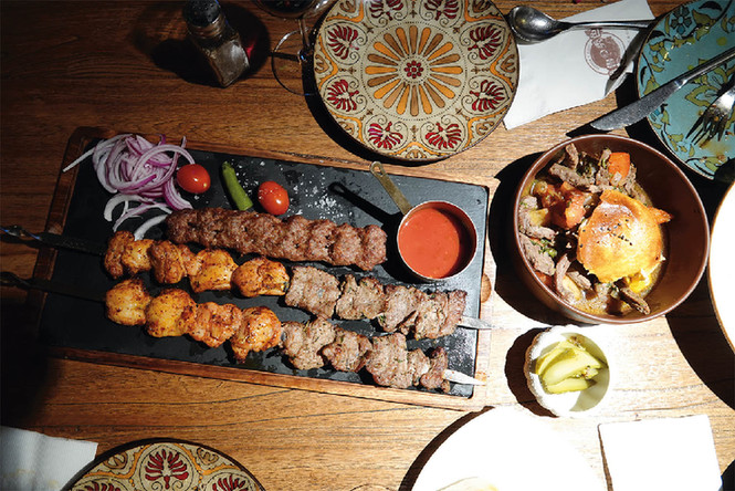 在这家名为“格鲁·秀色”的餐厅,目之所及的红砖拱门、铸铁壁炉、鹿角吊灯、原木吧台等格鲁吉亚经典元素,以及从格鲁吉亚运来的独特摆件、花团锦簇的露台庭院等等,无不充满异域风情。几乎每个餐桌上都摆放着长约半米、插着厚实肉块的肉串,或是滋滋冒着热气的硕大羊排,抑或是裹满浓郁奶酪的烤鸡。